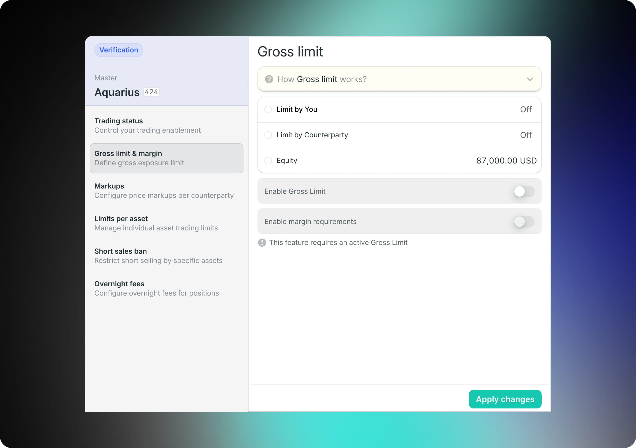 The Finery Markets risk management engine has been significantly upgraded to better meet the operational requirements of institutional participants. While the core system remains a robust tool for setting global and asset-specific limits, managing instruments, and defining collateral requirements, it has evolved into a fully modular framework designed for greater flexibility.