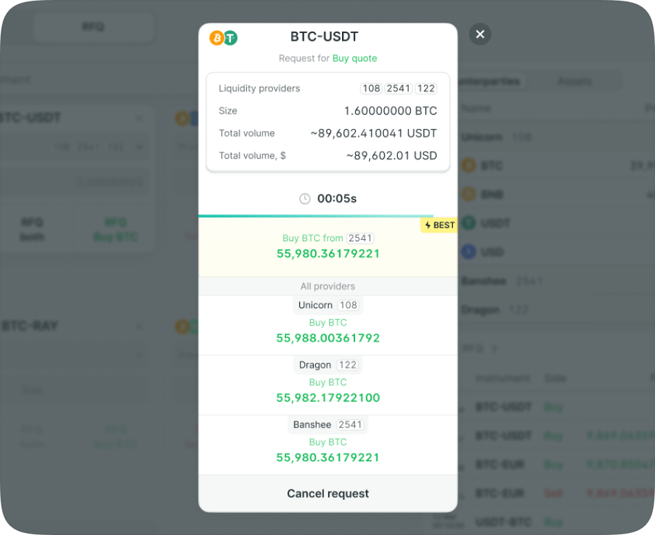 Minimize market impact: For large block trades, displaying your full size on an order book can move the market against you. With our RFQ, you request quotes for a defined volume, and multiple liquidity providers compete privately for your order. This process shields your trade from public view and helps achieve superior execution on large notional sizes.